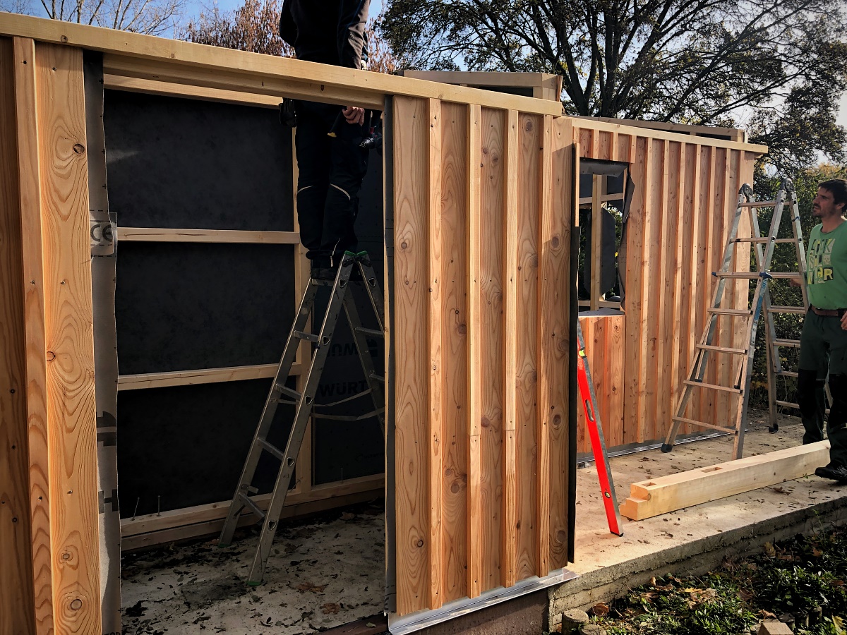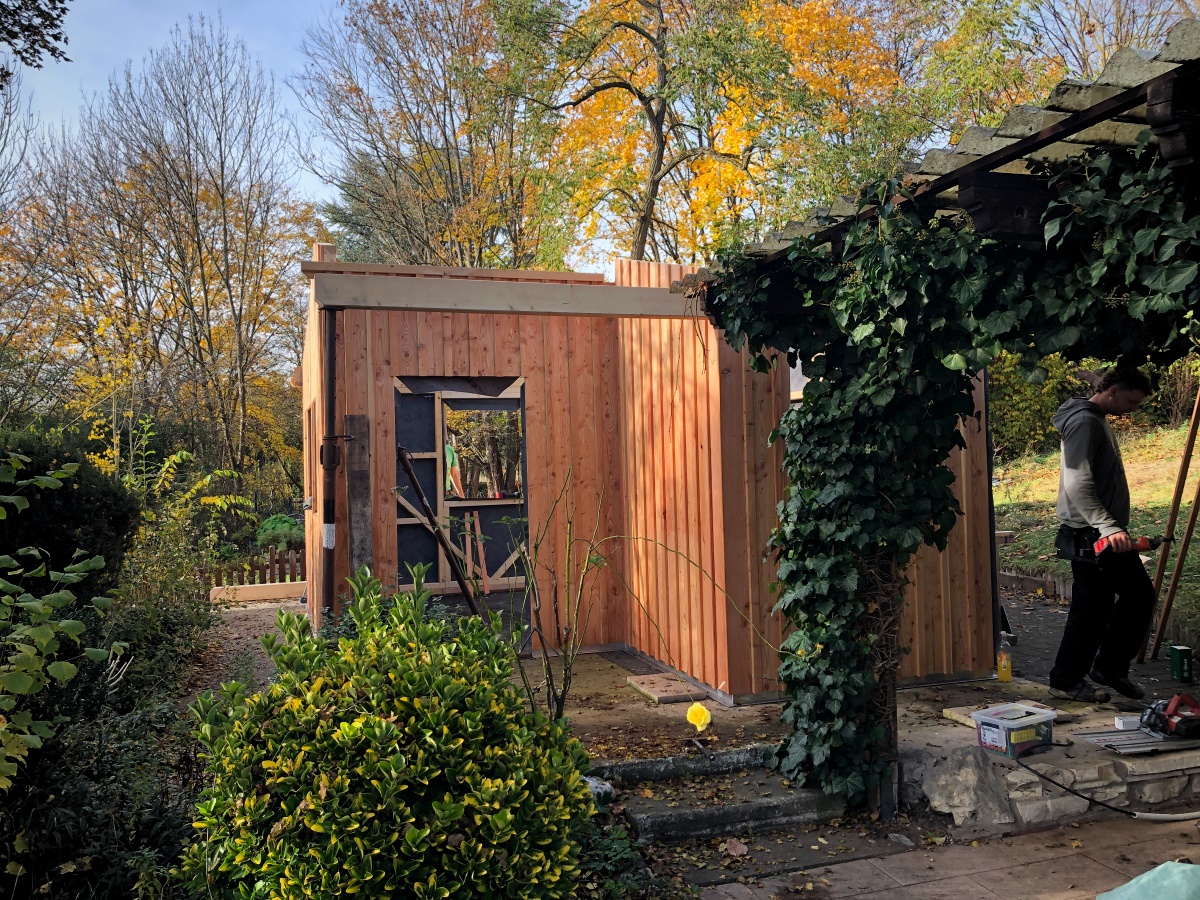 Heute wurde mit dem Aufbau der neuen Hütte im Kneipp-Garten begonnen: Die Zimmererleute hatten Zeit, das vorgefertige Material lag bereit und das Wetter zeigte sich endlich mal wieder von seiner spätherbstlich-schönen Seite! Unser rasender Bildreporter Dieter Dippel war extra hingeradelt, um das Geschehen vor Ort für uns im Bild festzuhalten:
