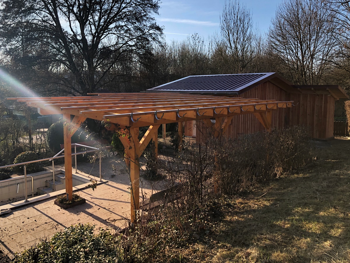 Dieter Dippel, unser vielfach bewährter Korrespondent aus den östlichen Stadtrandgefilden, hat heute weitere Baufortschritte im winterkalten Kneipp-Garten erspäht, abgelichtet und sogleich dem Schreiber dieser Zeilen in dessen leidlich warme Stube übermittelt. Das Resultat des jüngsten Einsatzes des Zimmerer-Teams ist augenfällig und nicht zu übersehen: Die Pergola steht wieder, oder vielmehr es steht eine komplett neue Konstruktion am alten Platz!