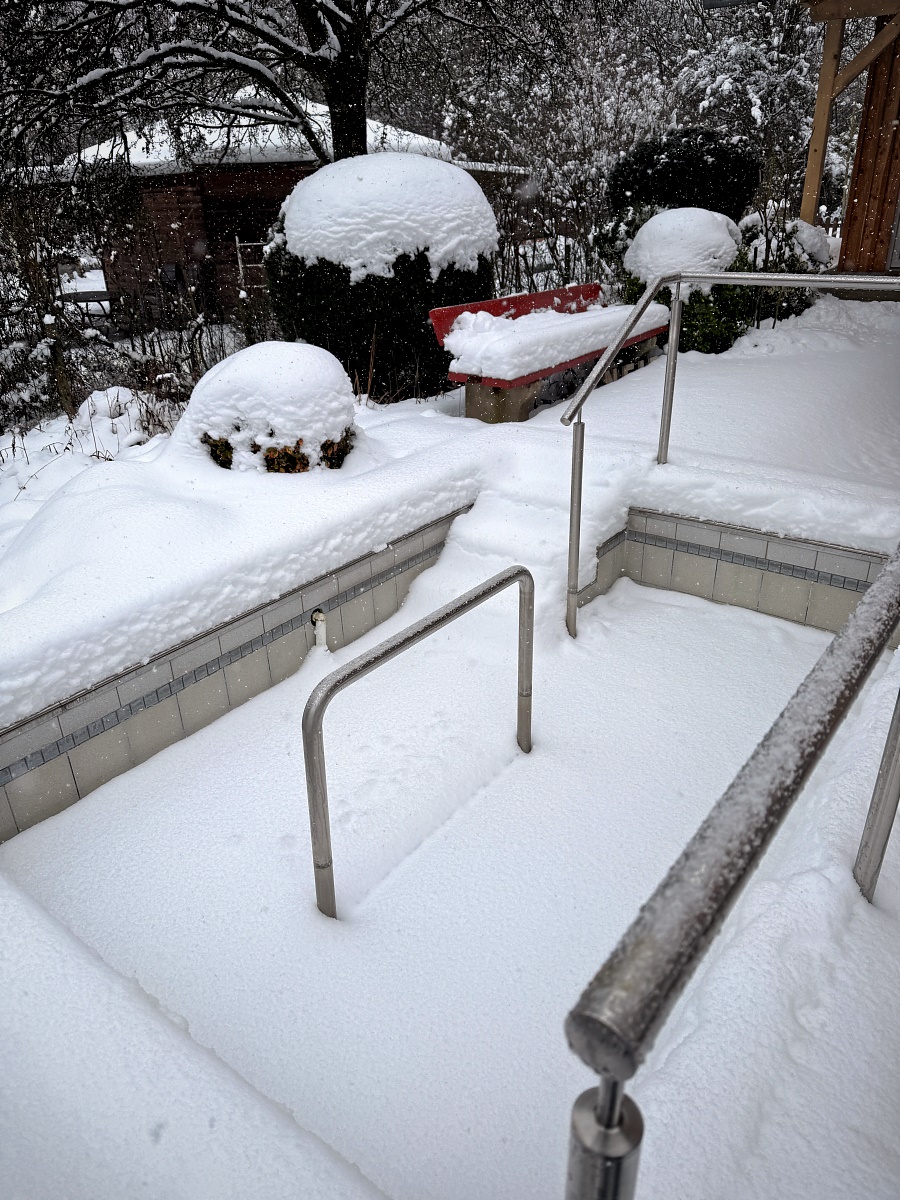 Eisbaden wäre dieser Tage eine saisonal passende Ergänzung unserer gesundheitsfördernden Aktivitäten! Allerdings würden sich vermutlich nicht genug Freiwillige finden, die rund um die Uhr aufpassen und ein Zufrieren des Wassertretbeckens (mit zerstörerischen Folgen) verhindern würden...